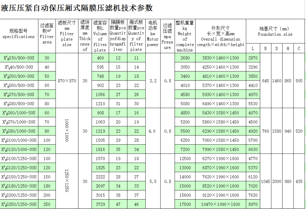隔膜壓濾機(jī)是由隔膜濾板(隔膜濾板是由兩片聚丙烯膜片與高強(qiáng)度聚丙烯芯板熱融合而成)和箱式濾板排列組成濾室,在輸料泵的作用下將料漿中的固體與液體分離,當(dāng)料漿中的固體形成餅以后,再向隔膜通入壓縮空氣,對濾室內(nèi)的固體充分壓榨,降低含水率。尤其對于粘性物料的過濾及對含水率要求高的用戶,此機(jī)更有獨(dú)特性。采用液壓裝置作為壓緊、松開濾板的動(dòng)力機(jī)構(gòu),操作簡單、性能穩(wěn)定。